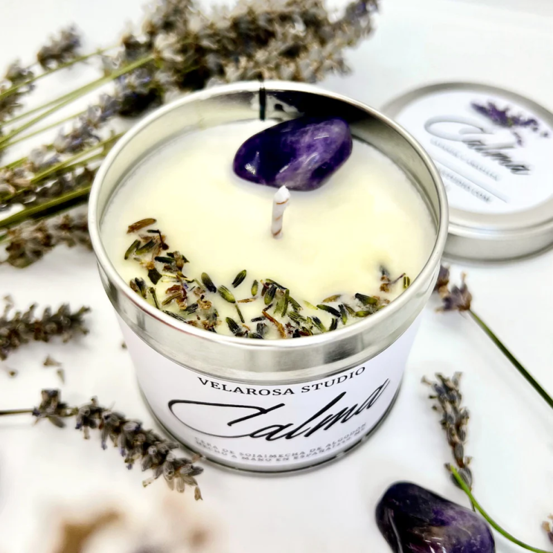 The "Calma" scented candle is a handmade handmade candle with a soft and relaxing aroma of fresh lavender.