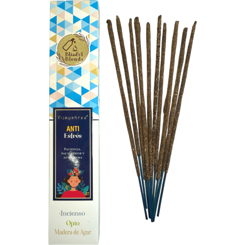 At HOSTENATURA, Europe's largest incense and esotericism store, we present Vijayshree's Blissful Blends Organic Anti-Stress Incense, a powerful and balancing blend of Frankincense, Opium and Agarwood. This unique formula is designed to relieve stress, reduce anxiety, and restore mental calm. With natural and 100% organic ingredients, this incense offers a purifying experience that cleanses the air and relaxes your body and mind in a profound way.